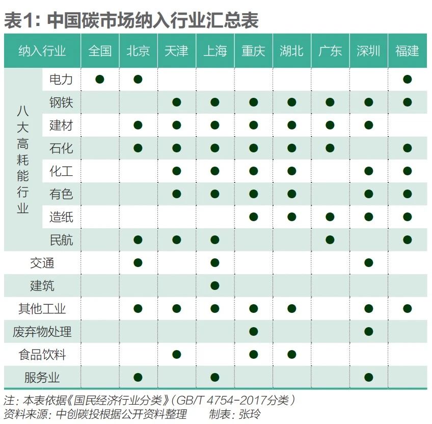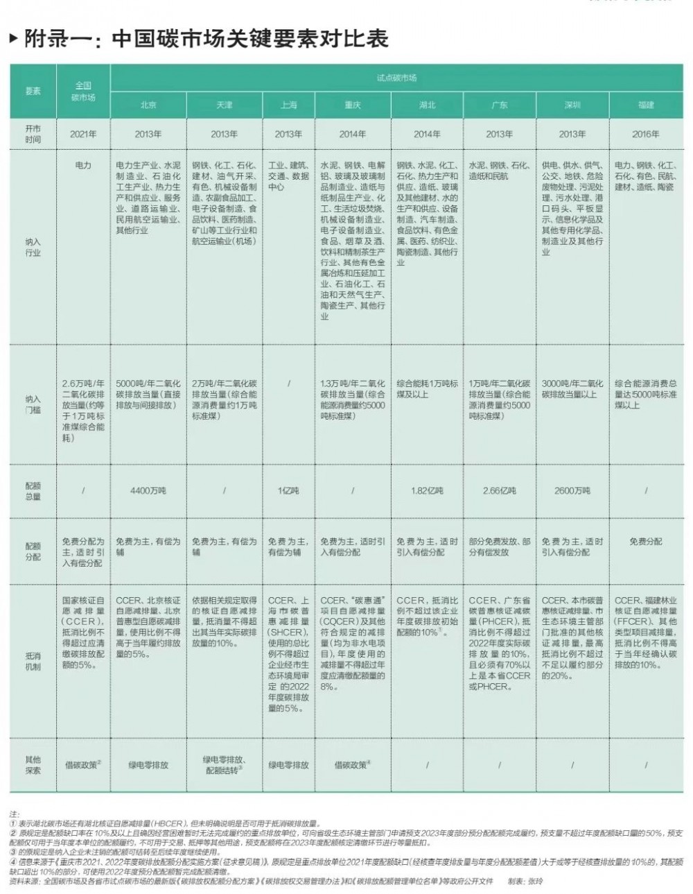 依据各碳市场最新版《碳排放权交易管理办法》《碳排放权配额分配方案》《碳排放配额管理单位名单》,本文梳理了纳入行业、配额分配方式和抵消机制等信息(详见文末附录一)。