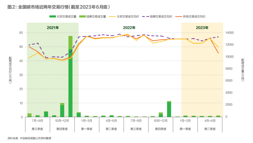 截至2023年6月底,全国碳市场交易量累计2.35亿吨,交易额107.87亿元,平均碳价45.83元/吨,收盘价60元/吨,相较于7月16日开盘价涨幅25%。