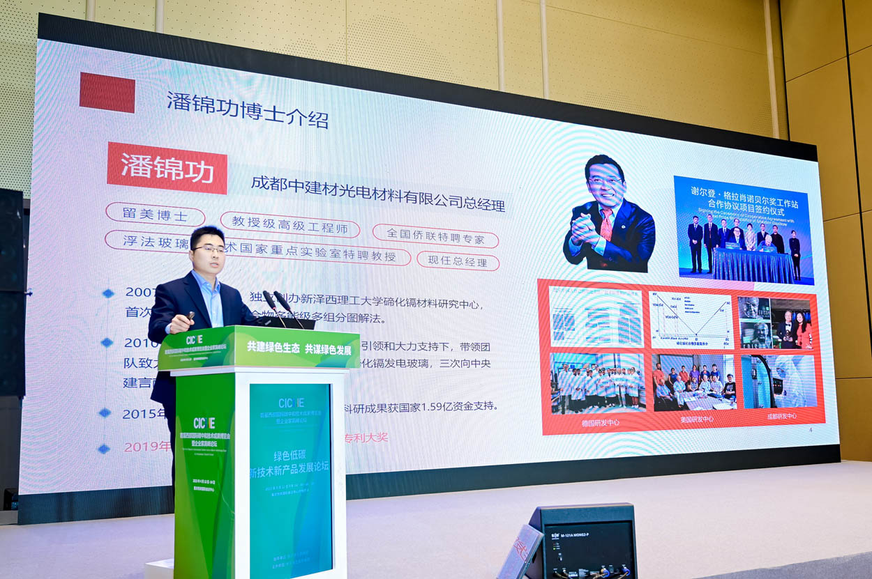 我先介绍一下我们公司成都中建材,如果没有这家公司在中国就没有大面积的碲化镉发电玻璃。我们是一家央企,作为三级央企也是国家级的绿色工厂,成立于2009年,目前公司有2个主营材料,其中一个是碲化镉发电玻璃。潘锦功博士是这项技术的创始人,2007年他和美国诺贝尔奖得主一位教授创办了研究中心,后来他回国后我们实现了这个材料的产业化,2019年拿到美国爱迪生发明专利大奖,目前我们有三个研发中心。全球前二十的光伏企业基本都是中国的,除了中国的企业,剩下排名第一的国外企业是美国的一个企业,他做的材料是碲化镉,跟我们一模一样,只是这个材料在中国起步比较晚。美国人很早以前就关注过这个材料,2010年美国国务卿来到这里,给两千万美金希望潘锦功博士回到美国做研究,当时拒绝了。后来美国参议院领袖来防邀请潘锦功博士回到美国,也拒绝了,他非常有家国情怀。2013年美国众议院来了,潘锦功博士又拒绝了。2018年我们装了产线,2019年我们拿了爱迪生发明大奖,感谢国家给了我们一个中国工业大奖,这是国务院批准的最高奖项。在四川省我们得了科学技术进步一等奖,我们拿了很多产品证书,论文专利四百多项,制定了很多行业标准。2019年工信部发文,关于我们重点新材料的首批次示范指导目录,中间有一个碲化镉发电玻璃在中国只有一家企业能做,就是我们。2020年国家发改委发文,绿色技术推广目录里面也约束了碲化镉发展玻璃,做大面积的也只有我们一家。去年11月四川省住建厅废止了一批老旧技术,提出了一批新型技术,碲化镉发电玻璃位于第一项节能减排的。去年12月18日国家机关事务管理局发文,一共提倡了55项新技术,把我们公司名字也写进去了,排第七项,这是国家对我们的支持。